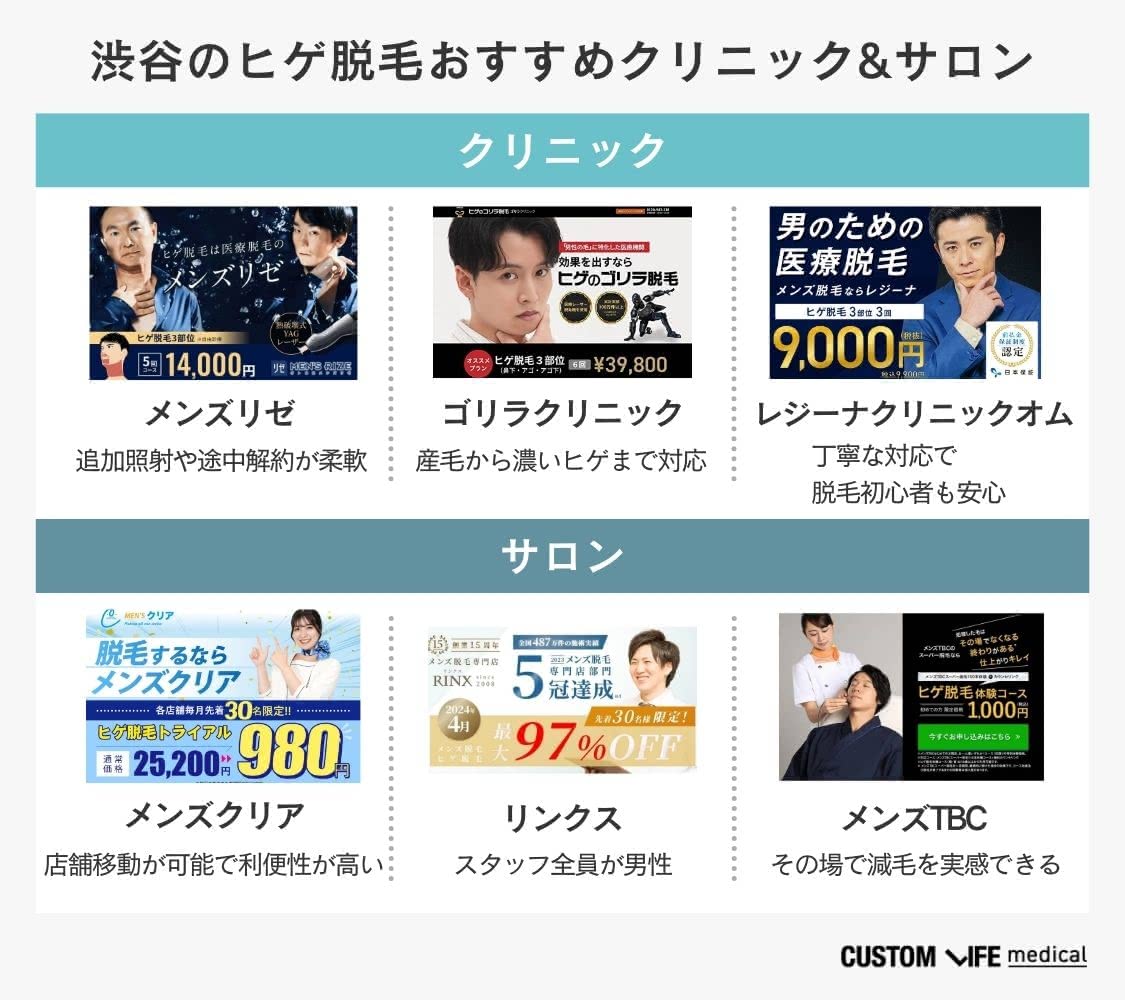 ここでは、渋谷でヒゲ脱毛におすすめクリニックに分けて紹介します。